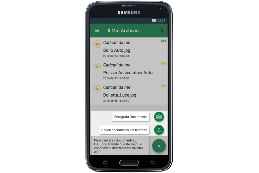 Effettuato l'accesso, hai ora la possibilità di caricare un qualsiasi documento. Premendo il tasto opzioni, un cerchio verde con un "+", ci saranno le opzioni: carica e scatta. Una volta caricato il documento sarà protetto dalla sicurezza della conservazione digitale.